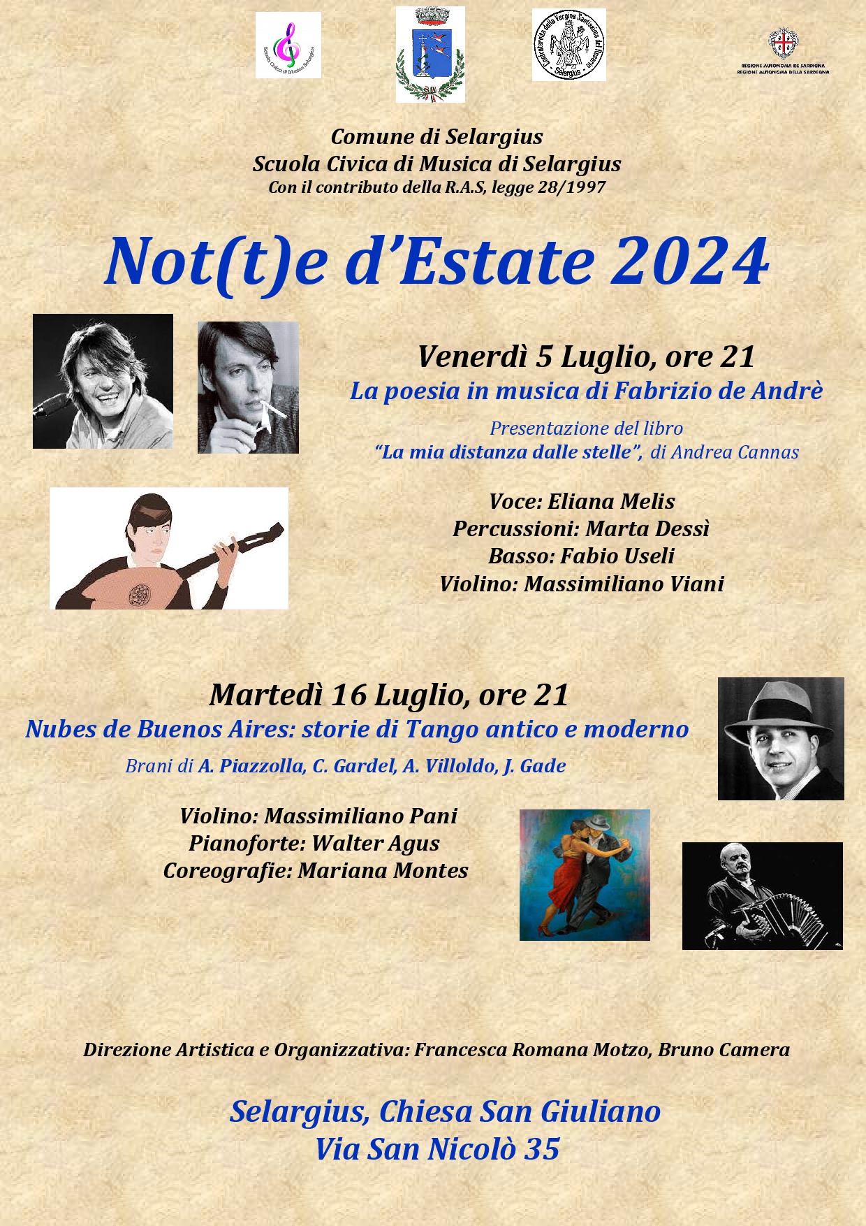 Eventi a cura della Scuola Civica di Musica di Selargius previsti nelle date del 05/07/2024 e 16/07/2024 presso la Chiesa di San Giuliano in Via San Nicolò 35.