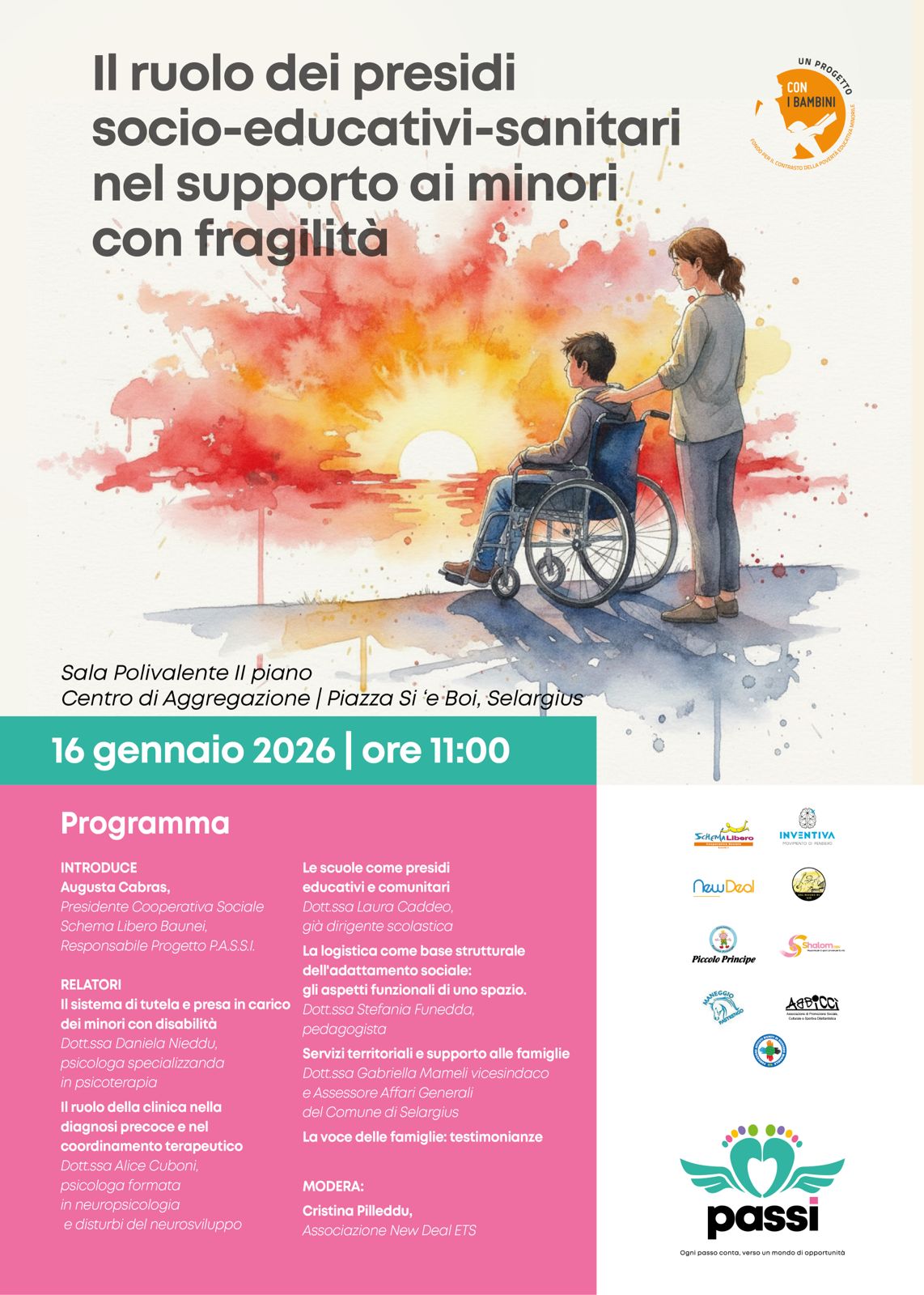 Il ruolo dei presidi socio-educativi-sanitari nel supporto ai minori con fragilità. Venerdì 16 gennaio 2026 h.11.00 -Sala Polivalente via Gallus 2 (Piazza Si'e Boi)