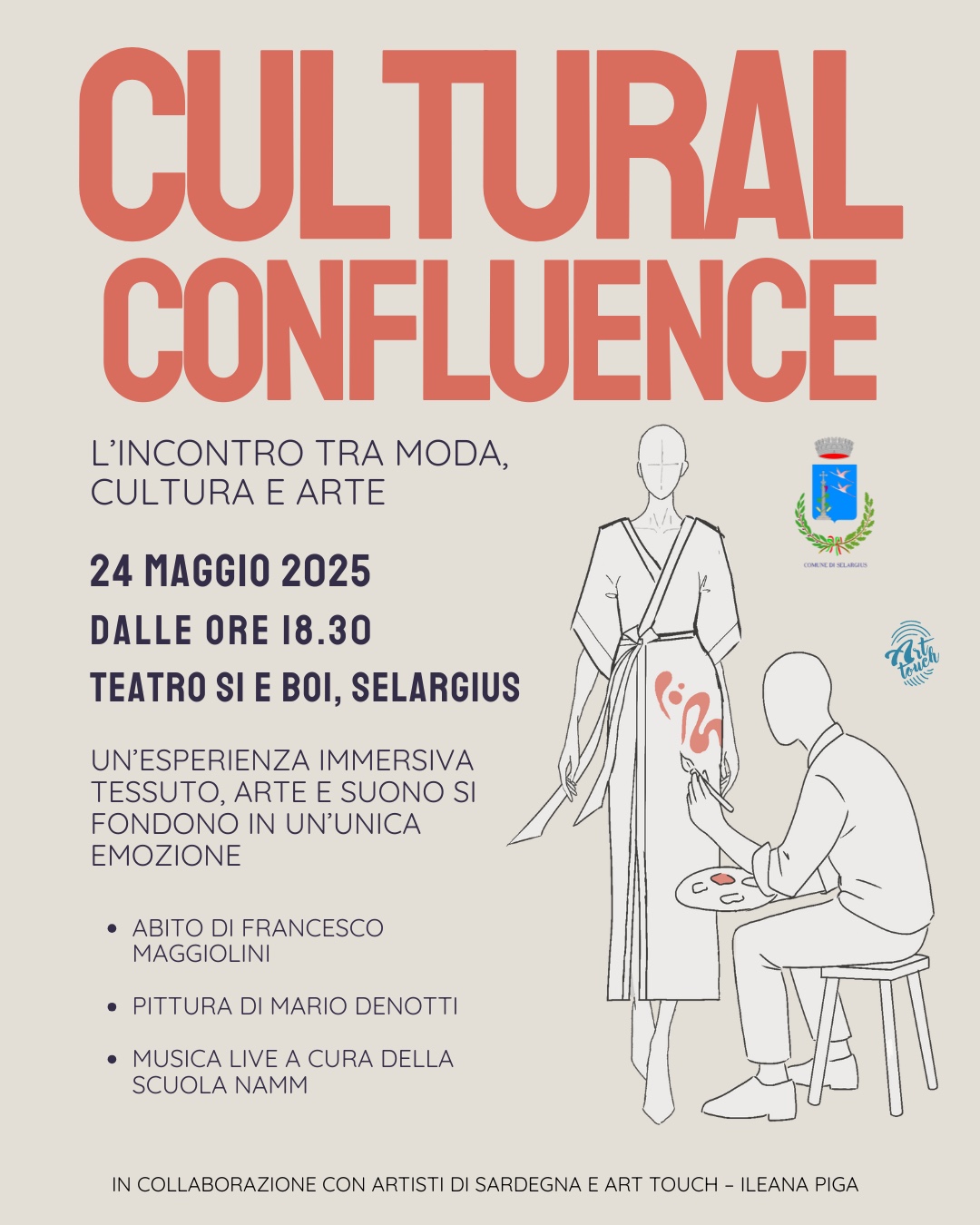 Sabato 24 alle ore 18:30 *Gli Artisti di Sardegna* in collaborazione con *Art Touch agenzia di servizi d'arte di Ileana Piga* presenta l'evento "Cultural confluence" incontro tra Moda, Pittura e Musica che vede coinvolti Francesco Maggiolini, Mario Denotti e la scuola di musica NAM. Tale momento rappresenta un ponte tra le due tradizioni l'eleganza Sarda tra i ciliegi Giapponesi.